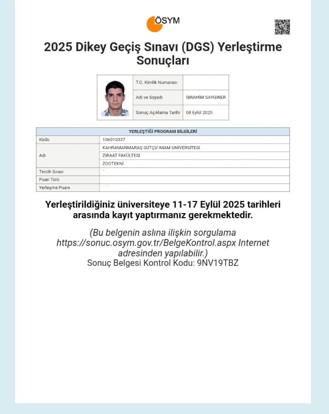 Yeşilhisar Meslek Yüksekokulu olarak bir mezunumuzun daha başarı öyküsüne tanıklık etmenin gururunu yaşıyoruz. Veterinerlik Bölümü mezunlarımızdan İbrahim Saygıner, 2025 Dikey Geçiş Sınavı (DGS) sonucunda, Kahramanmaraş Sütçü İmam Üniversitesi Ziraat Fakültesi Zootekni Bölümü’ne yerleşmeye hak kazanarak bizleri bir kez daha onurlandırdı.