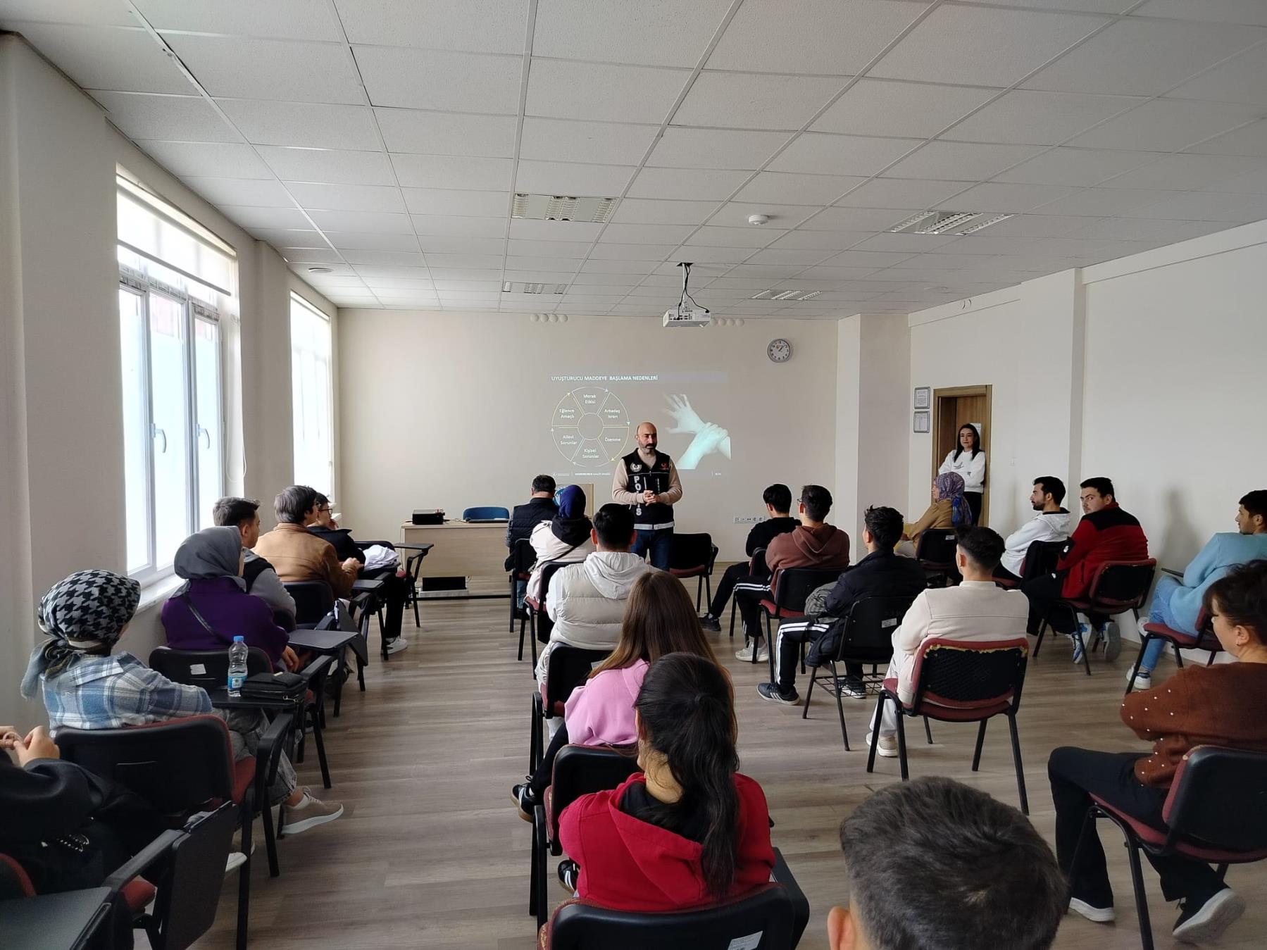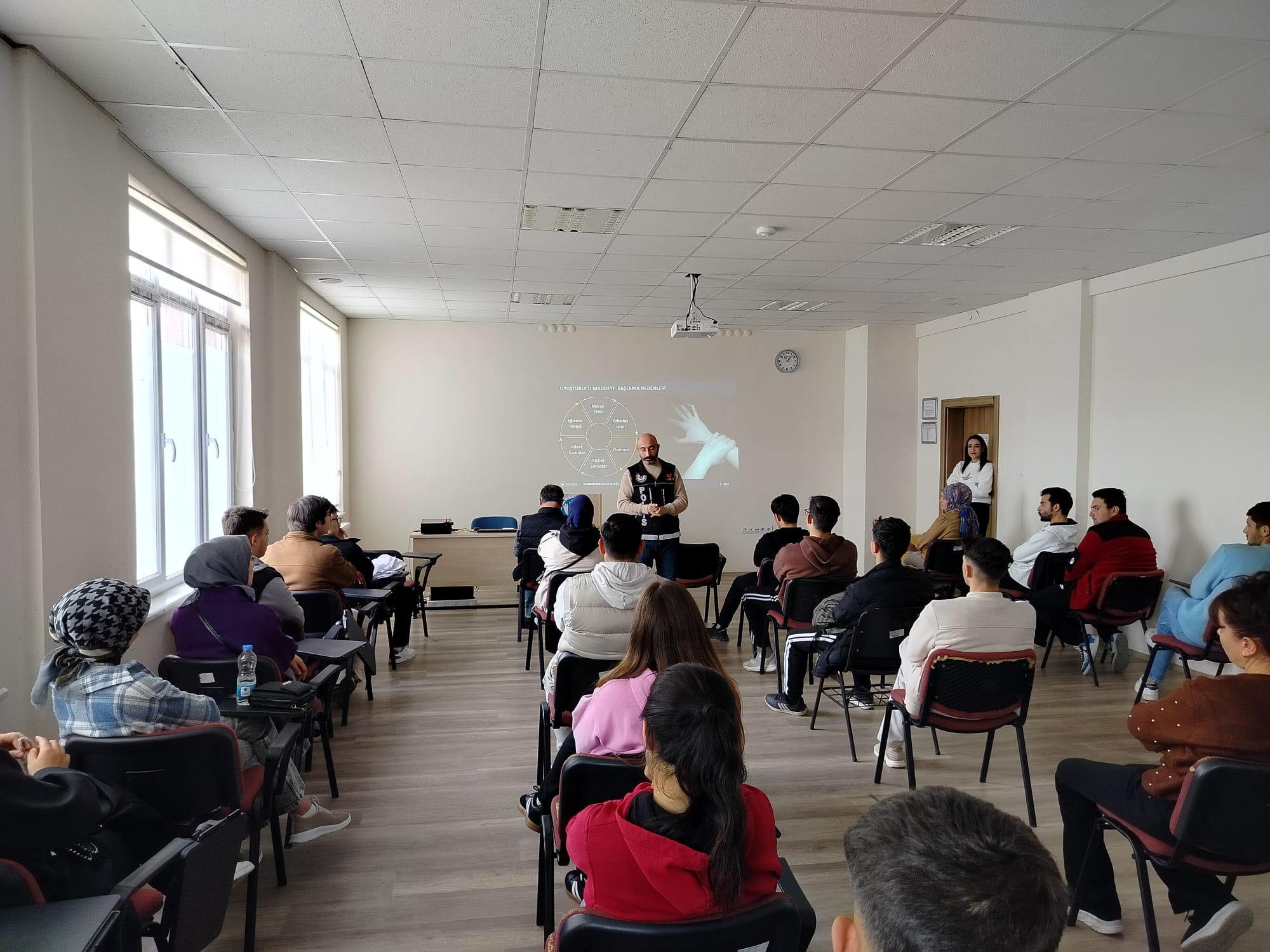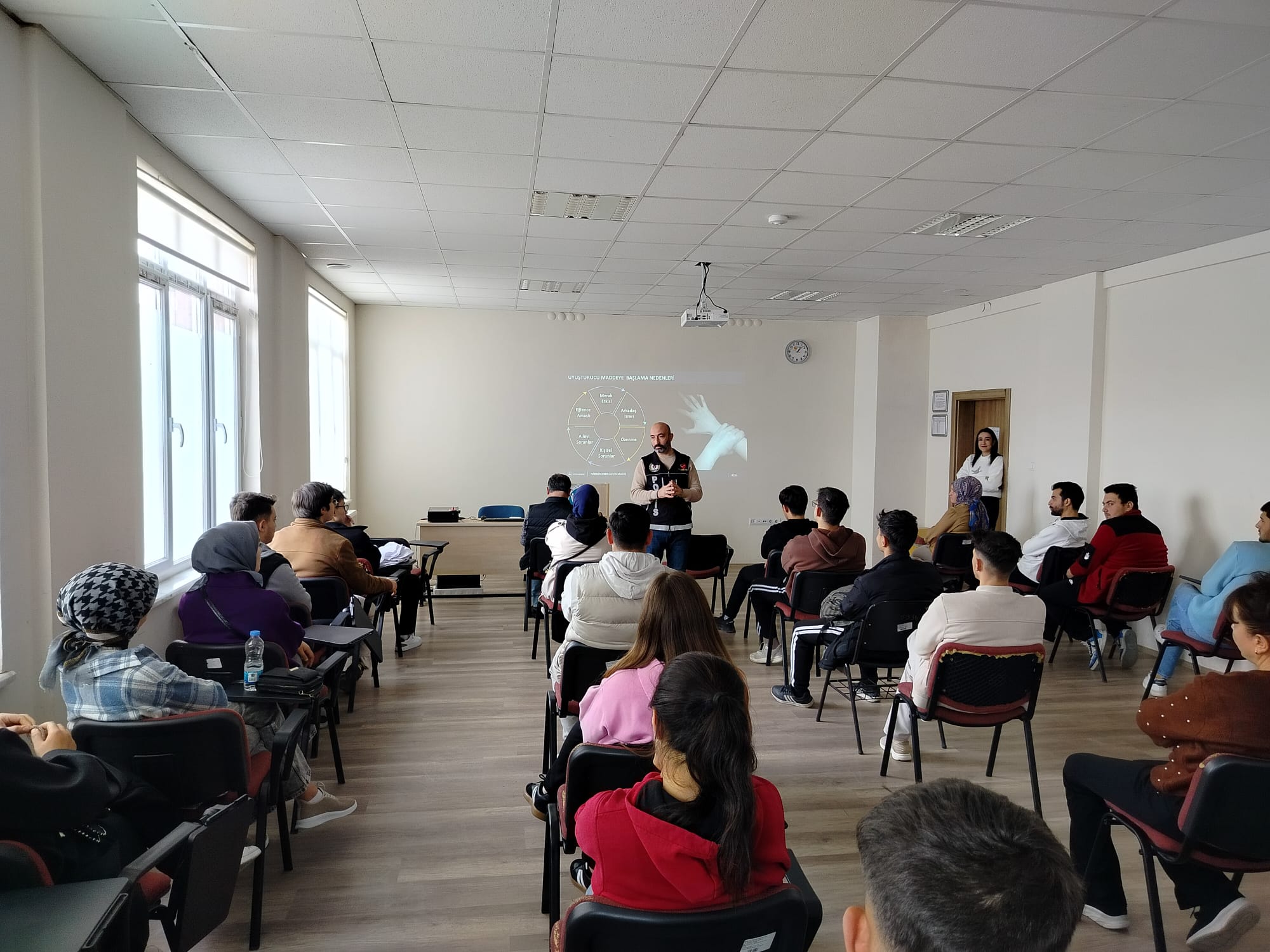 Etkinliğin konuşmacısı, Kayseri İl Emniyet Müdürlüğü’nden Mustafa Güneş, uyuşturucu maddelerin gençler üzerindeki etkileri, bağımlılığın oluşum süreci, korunma yolları ve mücadelede aile–okul iş birliğinin önemi hakkında kapsamlı bir sunum yaptı. Güneş, özellikle gençlerin karşılaşabileceği riskli ortamlar ve uyuşturucuya yönlendirme teşebbüsleri konusunda dikkat edilmesi gereken noktaları örneklerle anlattı.