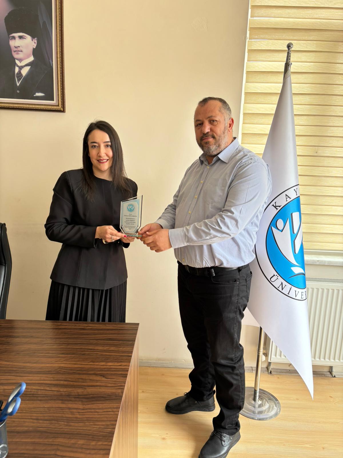 Günün anısına düzenlenen plaket takdiminde, Öğr. Gör. Koral Duygulu tarafından Doç. Dr. Zekiye Kocakaya’ya şükran plaketi sunuldu. Bu anlamlı hediye ile Kocakaya’nın kuruma verdiği emekler onurlandırılırken, okul yönetimi arasındaki bu nezaket ziyareti güzel bir hatıra fotoğrafıyla ölümsüzleştirildi.